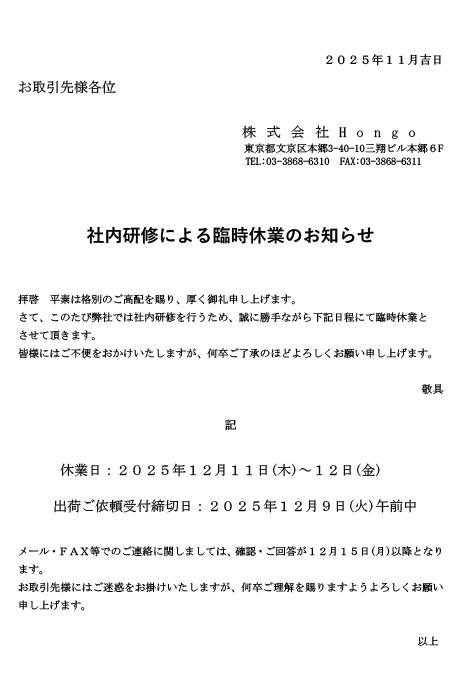 平素は格別のご愛顧を賜わり、厚く御礼申し上げます。誠に勝手ながら、弊社では下記日程を社内研修に伴う臨時休業とさせていただきます。